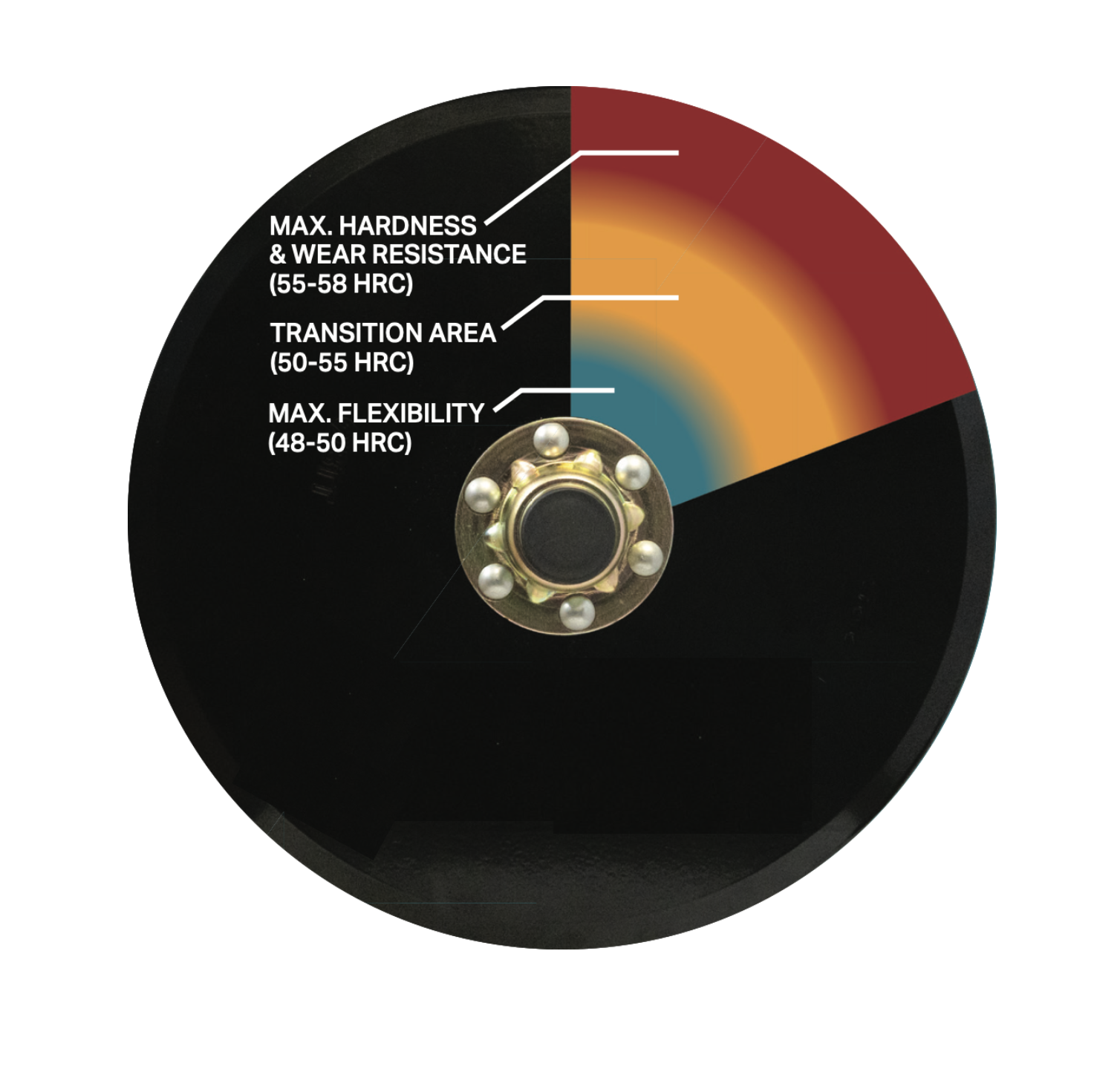 - Patented heat treating with 3 zones of hardness. Outer wear area heat treated for a super hard, long lasting, consistently sharp edge.
